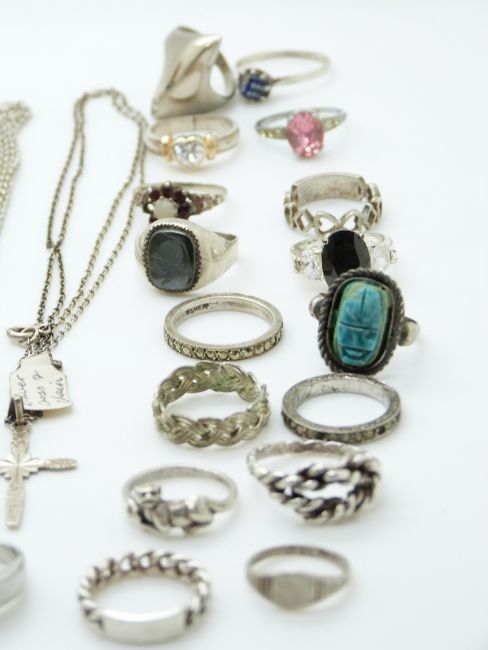 A collection of silver jewellery including twelve rings, bangles including Christening examples, brooches, filigree pendant etc