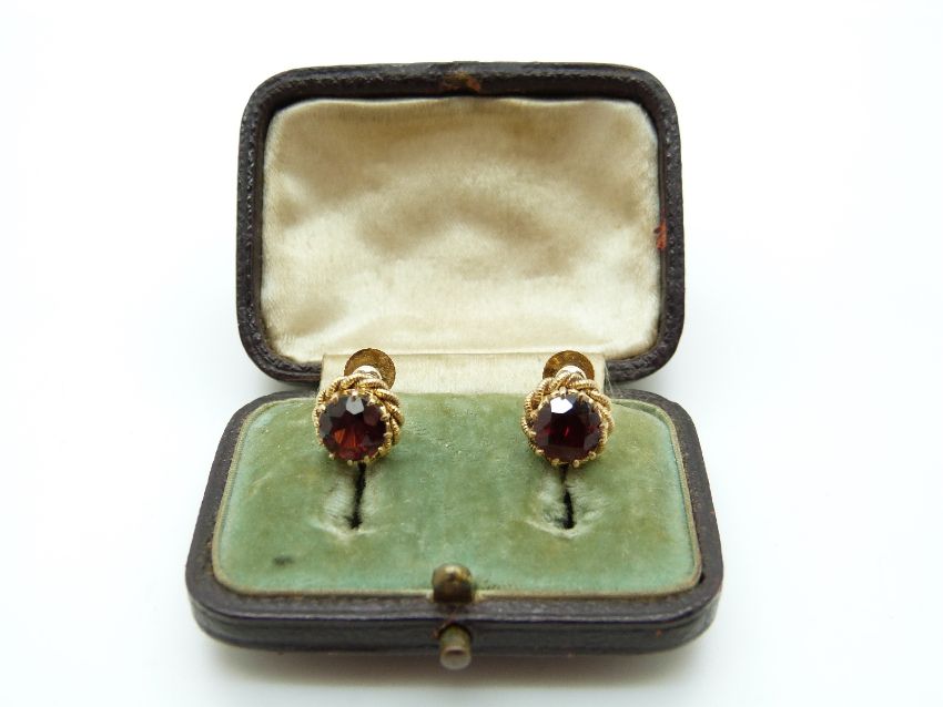 A pair of 15ct gold earrings set with a garnet to each