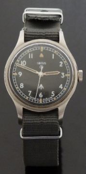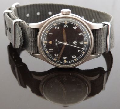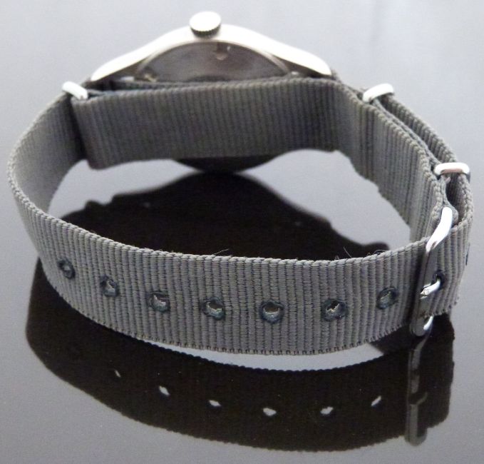 Smiths W10 gentleman's military wristwatch with luminous steel hands, white seconds hand, luminous hour markers, white Arabic numerals, railroad minute track, ministry arrow to the black face, stainless steel case marked to the back W10/6645-99-961-4045 0981/69 around ministry broad arrow and gilt 17 jewel calibre 60466E movement, on grey canvas NATO style strap, case diameter 34mm