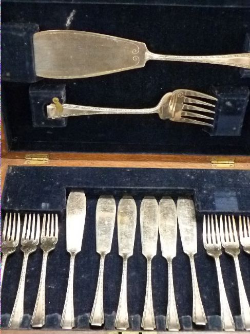 Novelty whisky and brandy dispenser in the form of barrels, width 36cm, together with a boxed set of fish knives and forks, servers etc in original case with ivorine label Page Keen and Page Plymouth