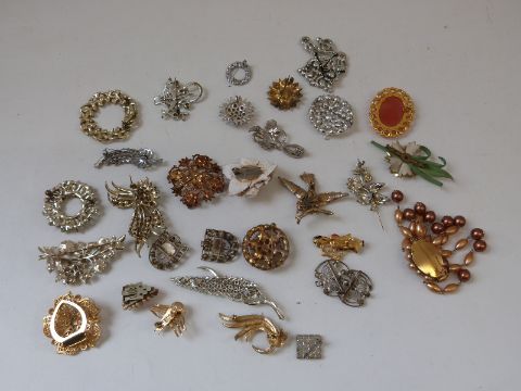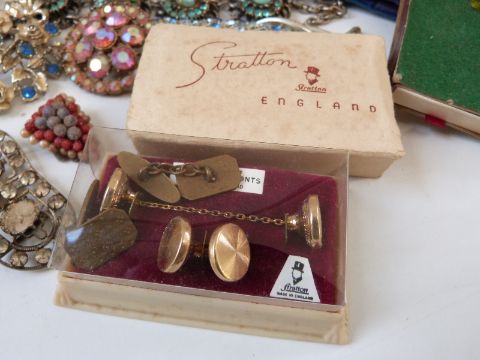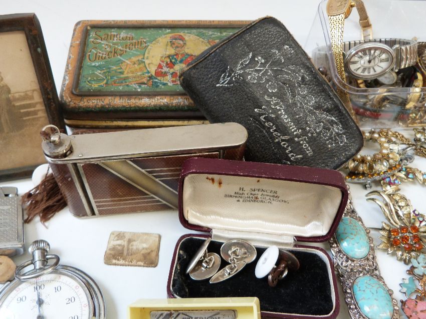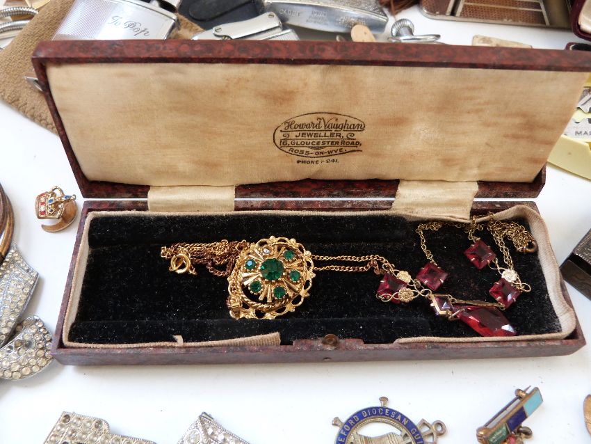 A collection of costume jewellery to include brooches, necklaces, Ronson lighter, watches, enamel brooches, paste brooches etc