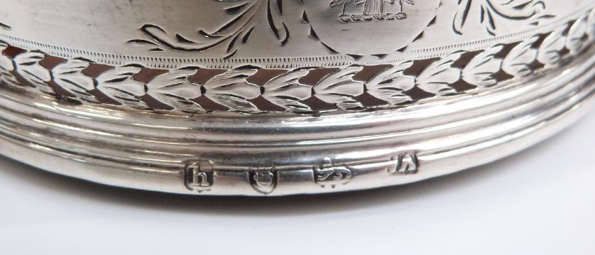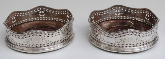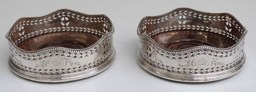 Georgian pair of hallmarked silver bright cut wine coasters, London 1783 maker William Abdy I, diameter 12cm