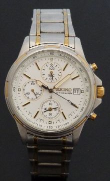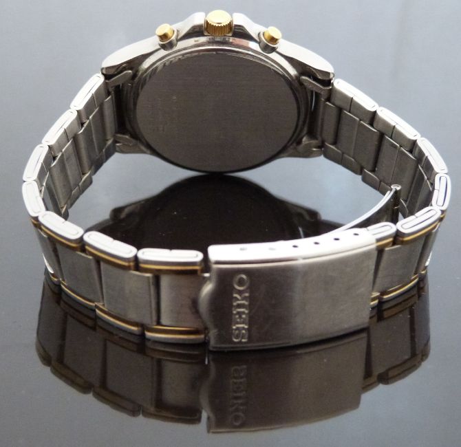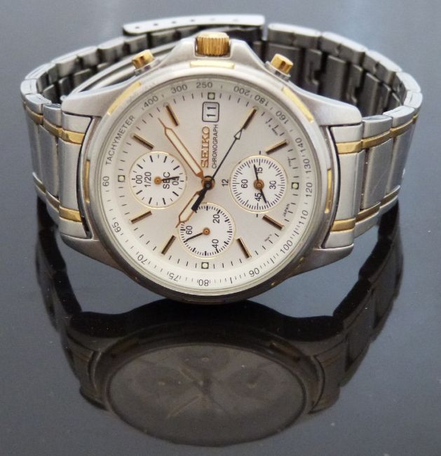 Seiko gentleman's chronograph wristwatch ref. 7T2-0BA0 with date aperture, luminous hands, two-tone baton markers, silver face and quartz movement, on bi-metal bracelet, case diameter 36.4mm, serial number 3D0195.