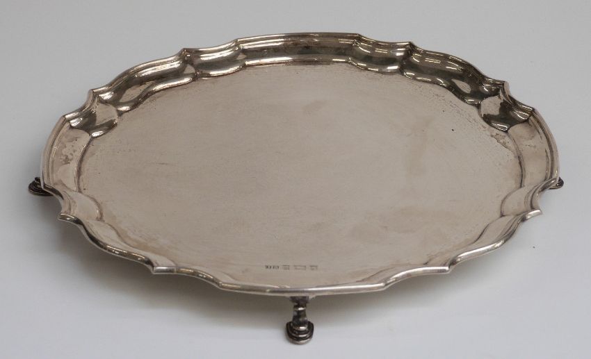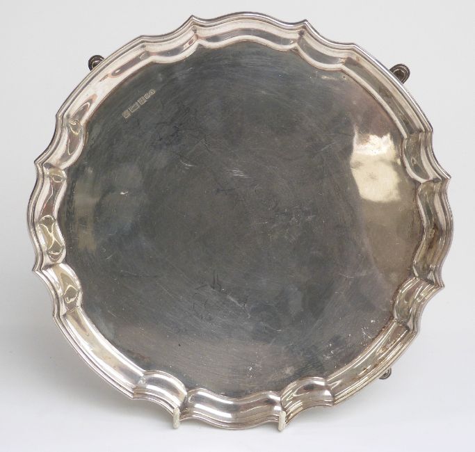 Hallmarked silver salver with piecrust edge raised on four feet, Birmingham 1971 maker John Rose, diameter 27cm, weight 453g