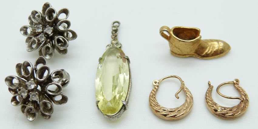 A pair of 9ct gold earrings, 0.9ct, a pair of silver earrings and a pendant