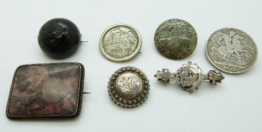 Georgian 1821 crown, agate brooches, Victorian jet brooch, Victorian sweetheart brooch, silver brooch and Japanese brooch