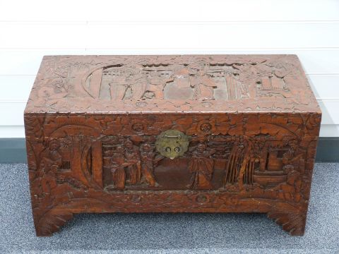 19th / early 20thC carved Eastern coffer with figures in landscapes W88 x D43 x H48cm