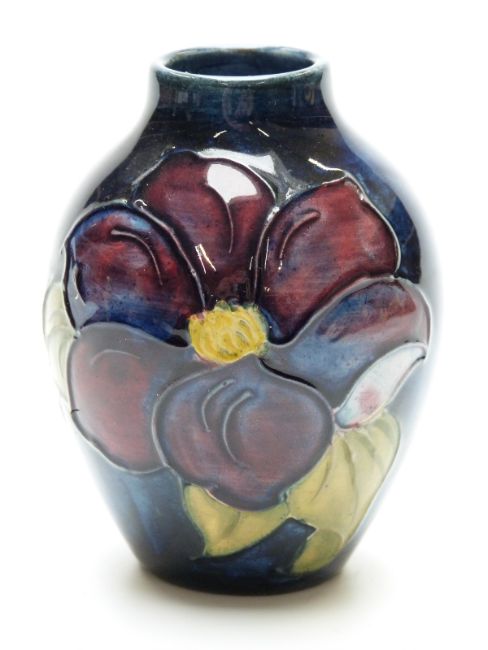 Moorcroft vase in Clematis pattern on a blue ground, 9cm tall