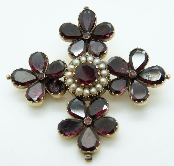 Victorian brooch set with foiled almandine garnets and seed pearls, verso a glass compartment set with hair, 8.42g, 4.5cm x 4.5cm