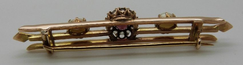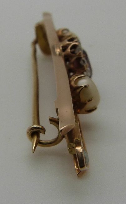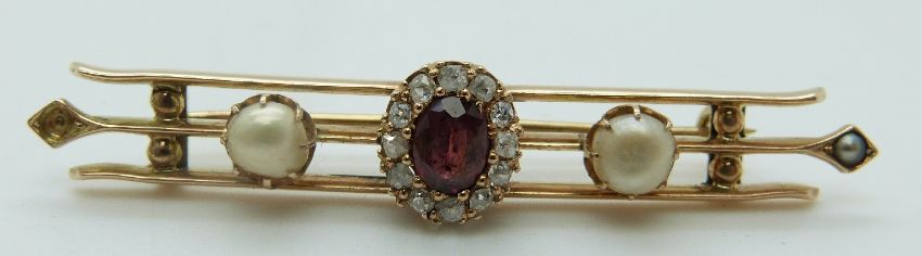 A Victorian brooch set with an oval cut garnet surrounded by diamonds and two further pearls (6.81g)