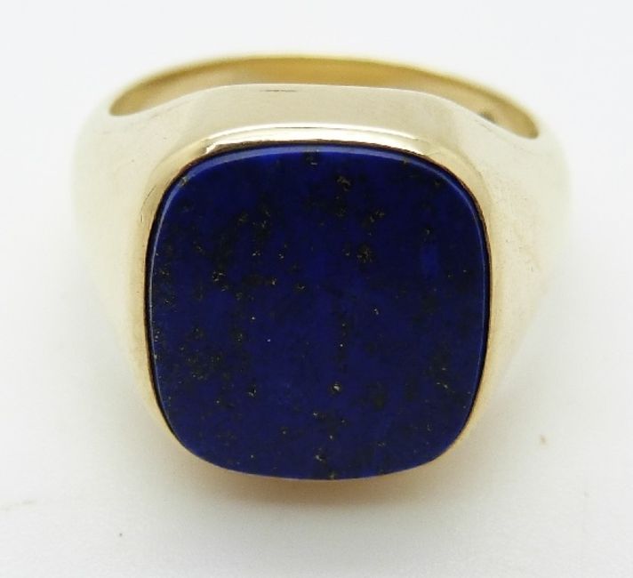 A 14ct gold signet ring set with a lapis lazuli section, size T/U, 15.55g