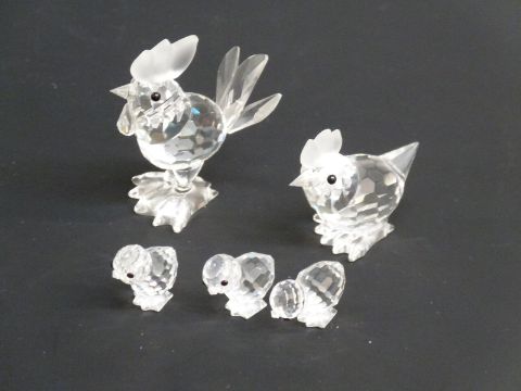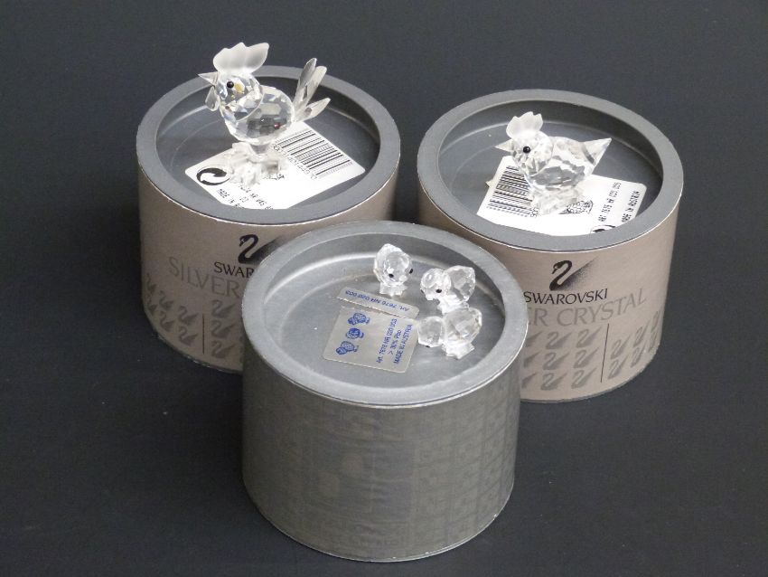 Five Swarovksi Crystal Chickens and Chicks, largest 5cm tall, in original boxes