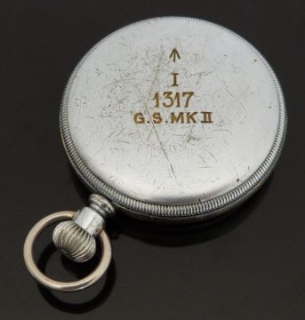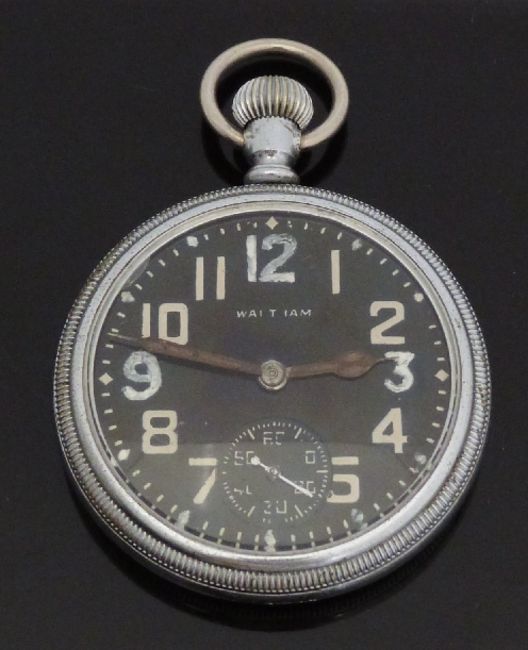 Waltham military issue open faced keyless winding pocket watch with black face, Arabic numerals, inset subsidiary seconds dial, screw case back marked 'I 1317 G.S.MK II' below ministry broad arrow and signed nine jewel movement, case diameter 51mm, serial number 961533.