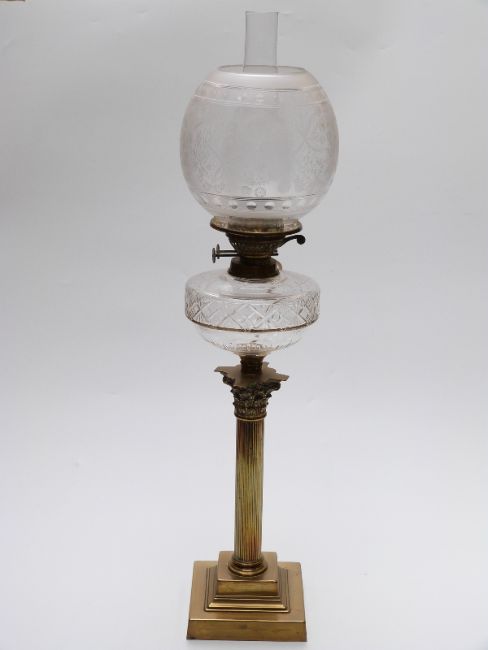Brass Corinthian column and cut glass oil lamp, height 80cm