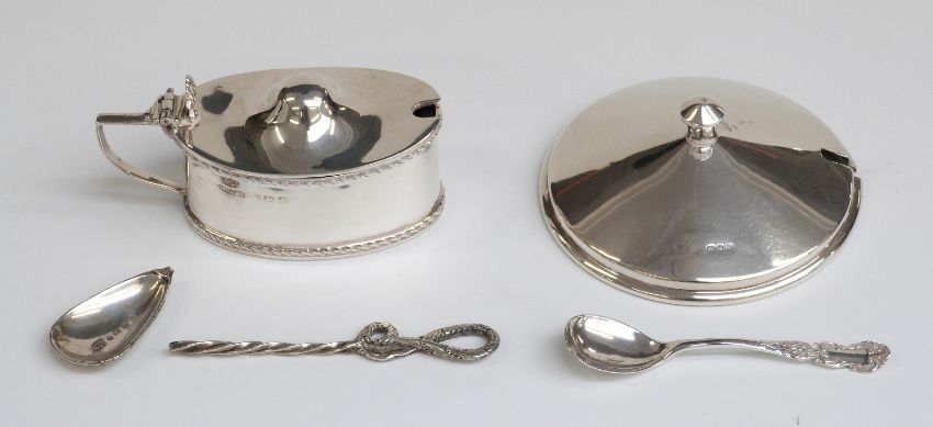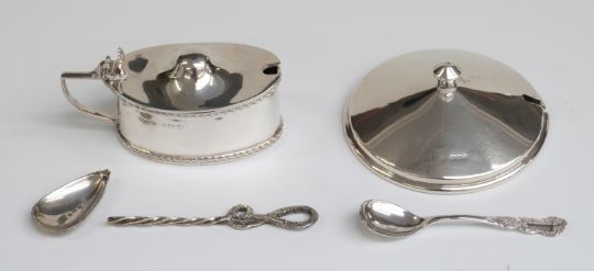 George V hallmarked silver mustard, silver pot lid, Victorian silver spoon etc, weight of silver 107g