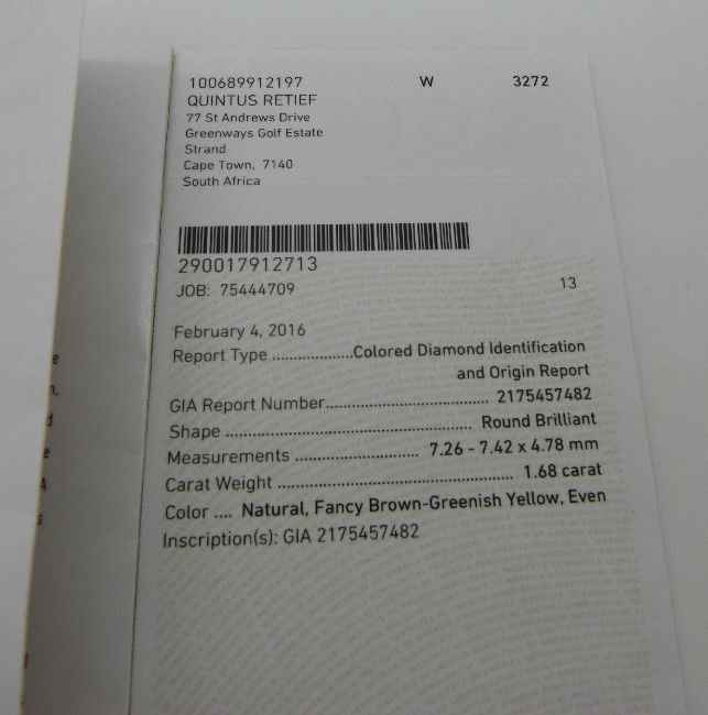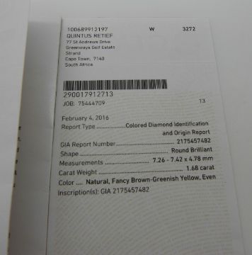 A round brilliant cut fancy brown-greenish yellow coloured diamond of approximately 1.68ct, with GIA report