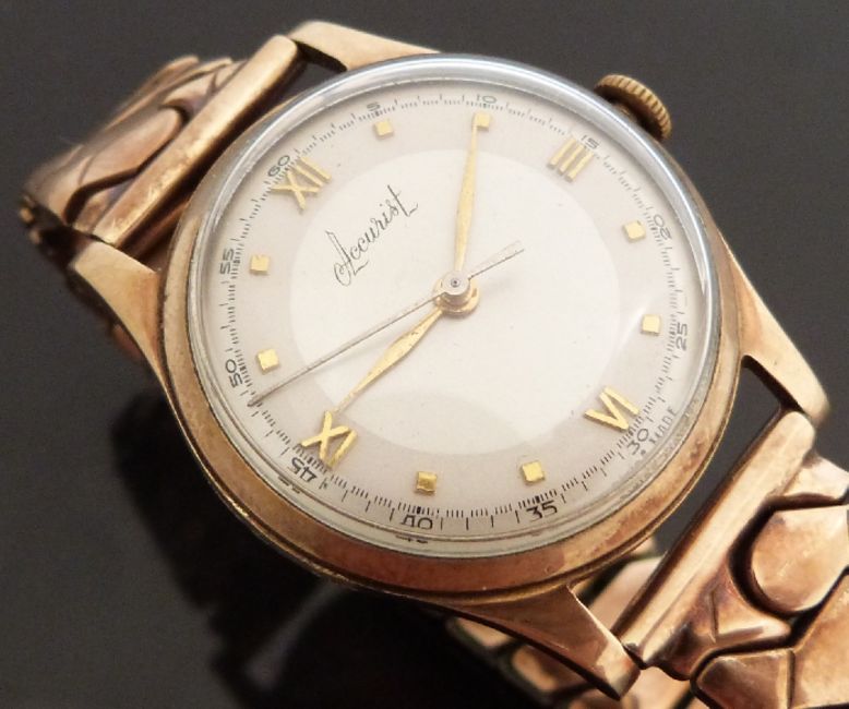 Accurist 9ct gold gentleman's wristwatch with gold Roman numerals, hands and square markers and two-tone face, on expanding metal strap, case diameter 30mm.