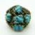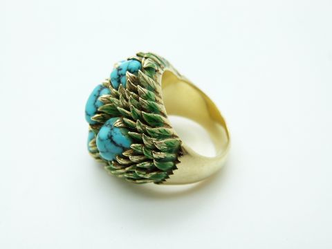 A 14k gold ring set with five turquoise cabochons surrounded by green enamelled leaves, size Q, 22.51g