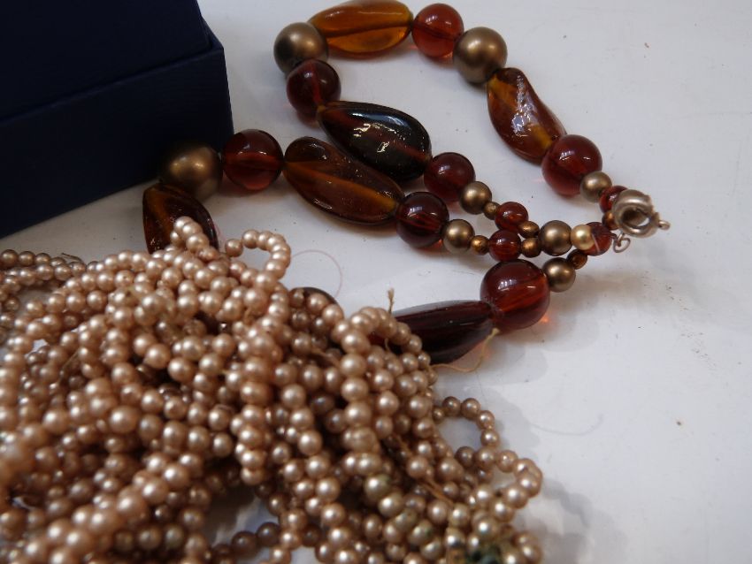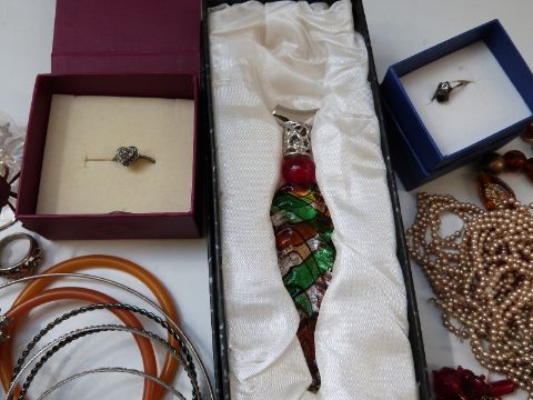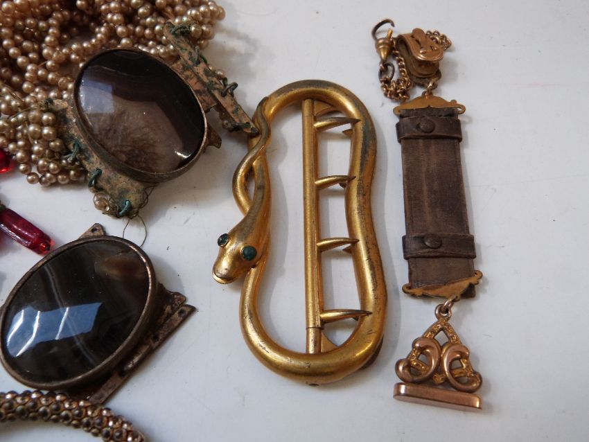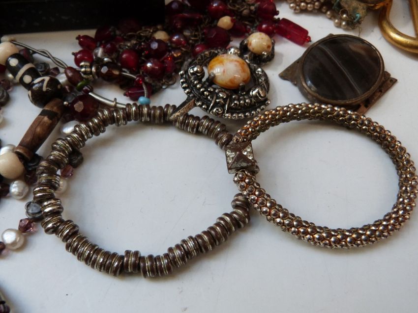 Silver jewellery including ring, bangles and necklace, agate buckle, buckle in the form of a snake, gold plated fobs etc