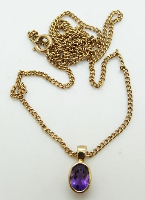 A 9ct gold pendant set with an oval amethyst on a 9ct gold chain, 3.9g