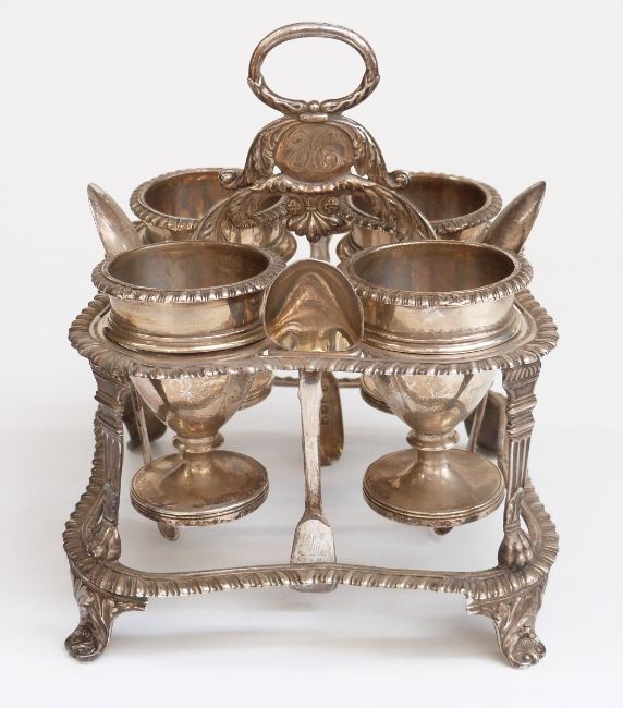 Georgian hallmarked silver four person egg set with gadrooned decoration, cups and stand, London 1816 maker Rebecca Emes & Edward Barrad I, spoons London 1815 maker William Eley & William Fearn, height 16cm, weight 62g