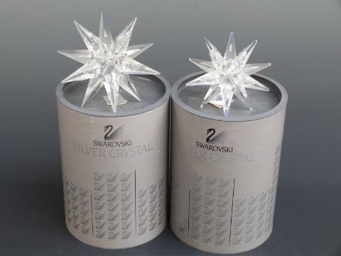 Set of two graduated Swarovski Crystal cut glass Star Candle Holders, largest 13.5cm in diameter, in original boxes