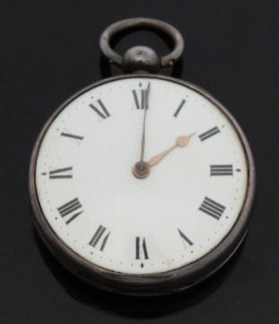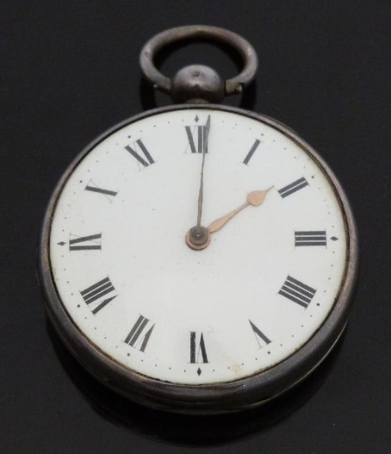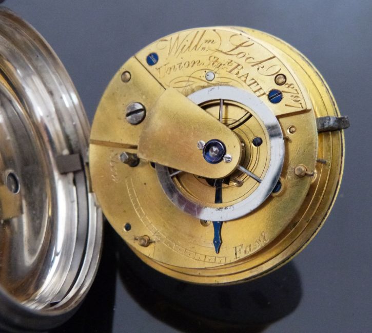 William Lock of Union Street, Bath hallmarked silver open faced pocket watch with gold hands, black Roman numerals, white enamel face and signed movement, case diameter 51mm, serial number 8797, London 1825