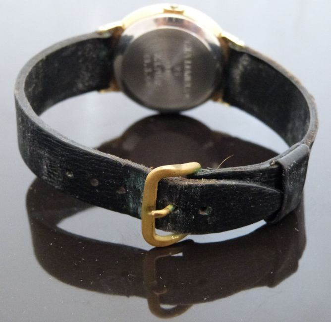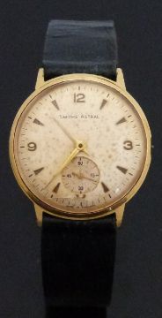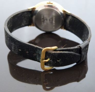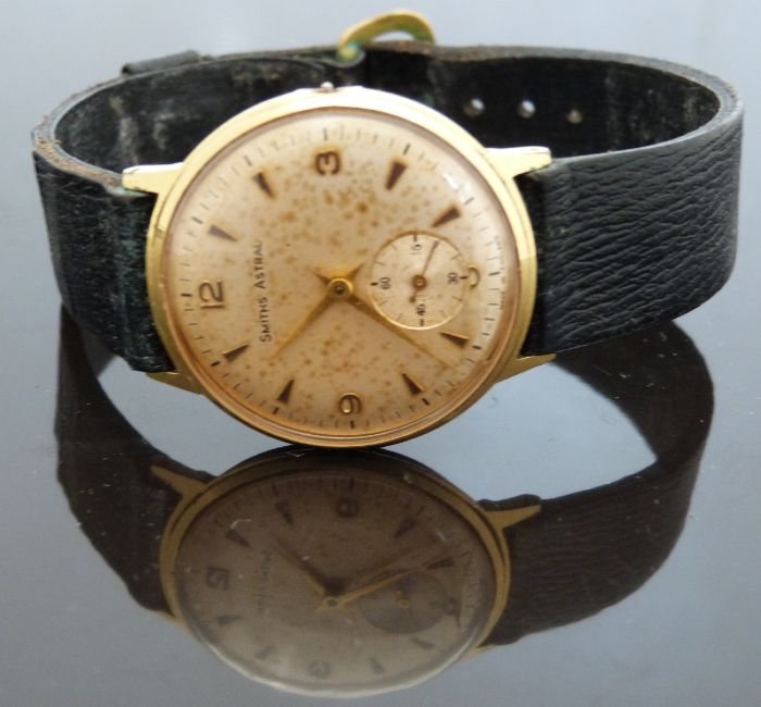 Smiths Astral gold plated gentleman's wristwatch with inset subsidiary seconds dial, gold hands, champagne face and gilt calibre 44 15 jewel movement, on black leather strap, case diameter 33.3mm.