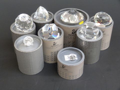 Eight Swarovski Crystal cut glass paperweights, largest 8cm in diameter, in original boxes