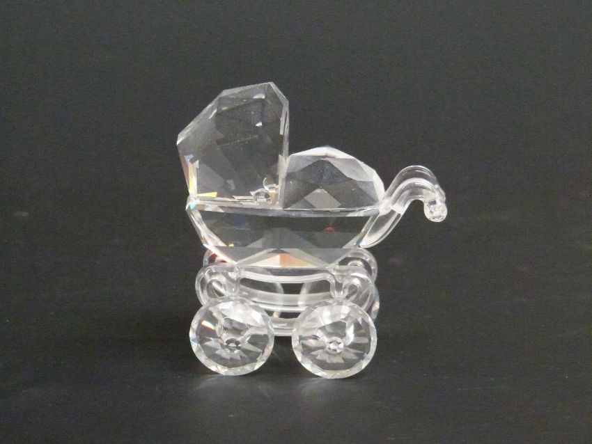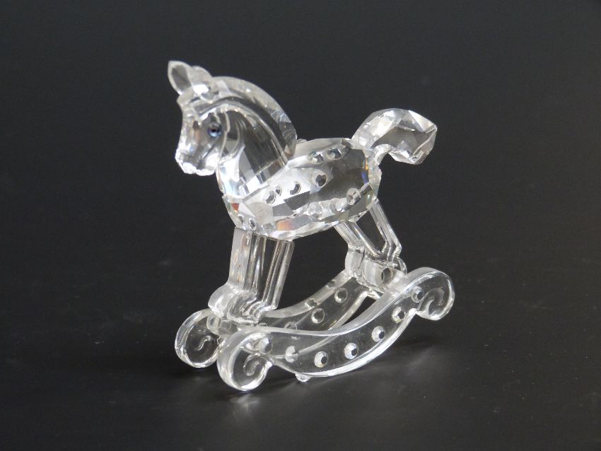 Three Swarovski Crystal cut glass items, Baby Carriage, Rocking Horse and Red Riding Hood, largest 9cm tall, all in original boxes with certificates
