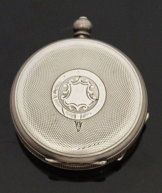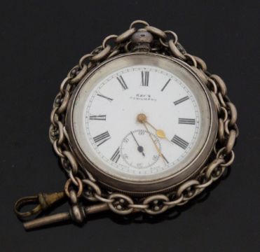 Kay's Triumph hallmarked silver open faced pocket watch with inset subsidiary seconds dial, gold hands, black Roman numerals and engraved case, on white metal Albert with hallmarked silver T bar and 9ct gold loop, case diameter 50.5mm, serial number 1274952.