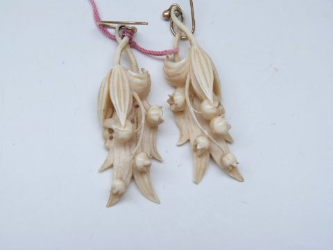 A pair of 19th/early 20thC carved ivory earrings, a bone cross, a faux ivory and coral necklace and a coral necklace made up of barrel shaped and small round beads
