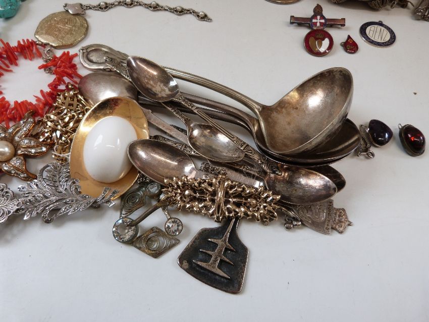 A large collection of costume jewellery including turquoise necklace, coral necklace, brooches, beads, silver plate, etc