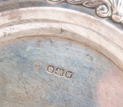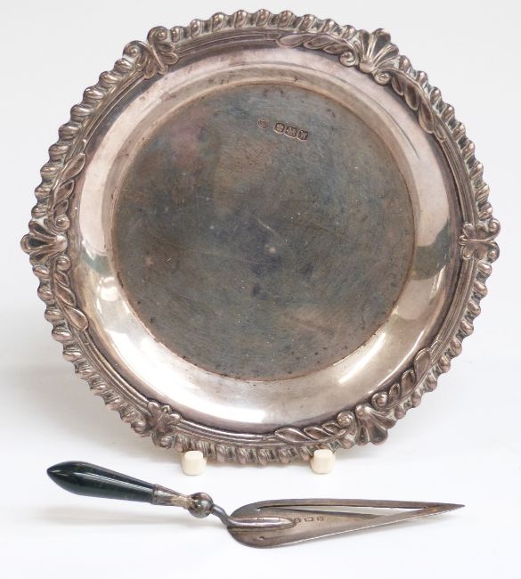Hallmarked silver bookmark in the form of a miniature trowel and a hallmarked pin dish, diameter 9.5cm, weight 39g