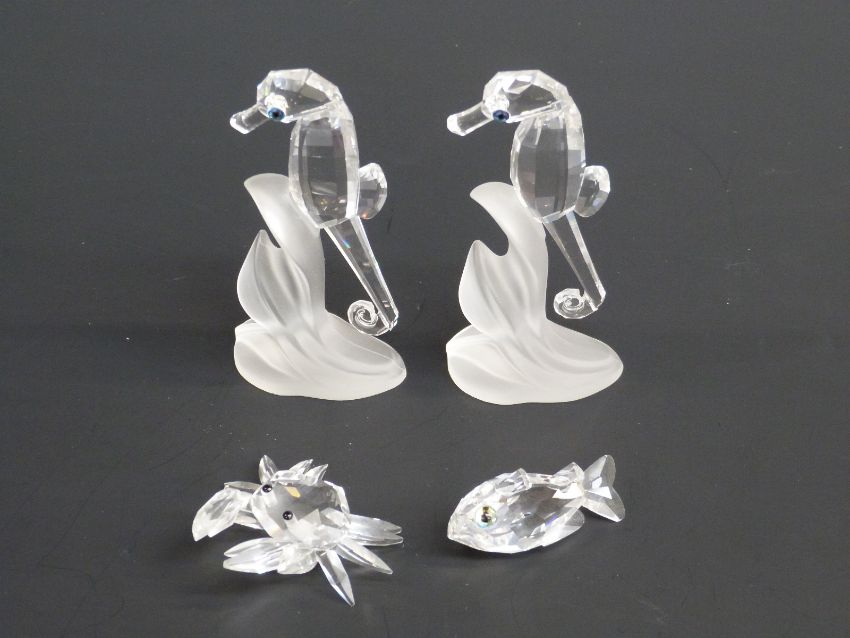 Four Swarovksi Crystal Animals Crab, Fish and two Seahorses, largest 8cm tall, in original boxes with certificates