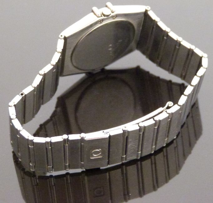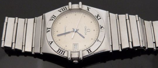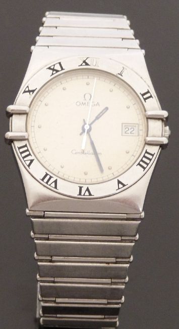 Omega Constellation gentleman's wristwatch with date aperture, blue luminous hands and black Roman numerals to the champagne face, on stainless steel bracelet, case diameter 32mm, in original case with SafeGuard valuation