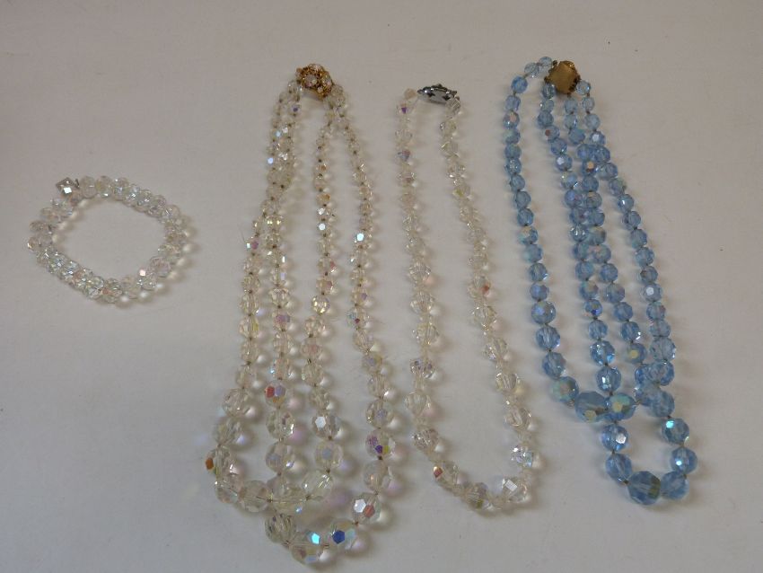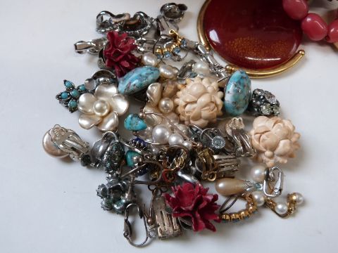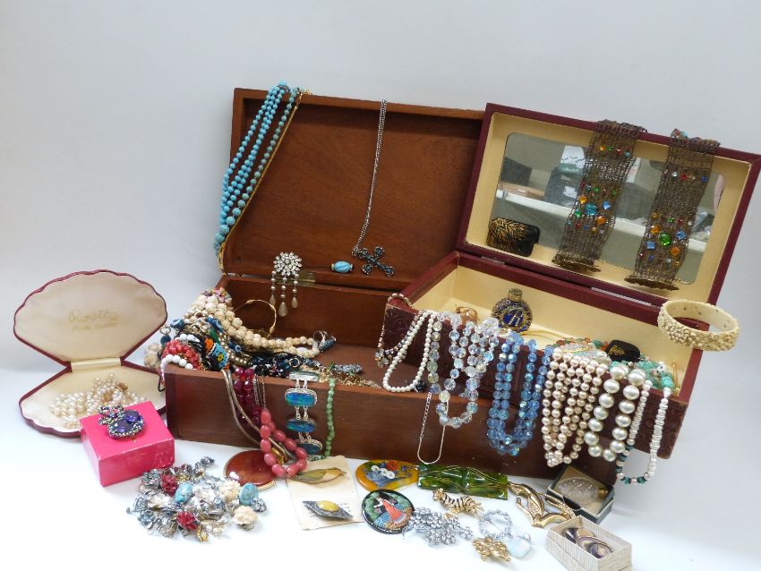 A collection of costume jewellery including a three strand faux pearl necklace with 9ct gold clasp, beads, brooches, earrings, lacquer brooch & pendant, etc