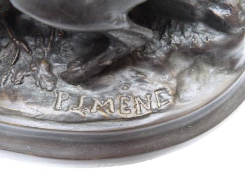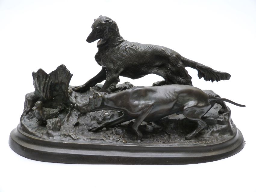 After P J Mene bronze figure of pointer and setter dogs and duck, length 39cm