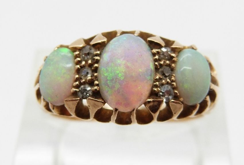 Edwardian 18ct gold ring set with three opal cabochon and six diamonds, Chester 1908, size Q