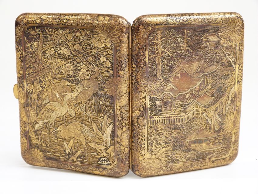 Japanese cigarette case with engraved gilt decoration, the front decorated with a landscape, the back with birds, length 9cm