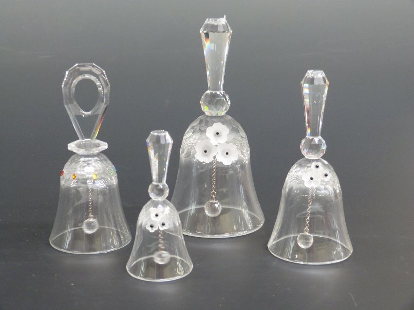 Four Swarovski Crystal cut glass Hand Bells, largest 14.5cm tall, in original boxes