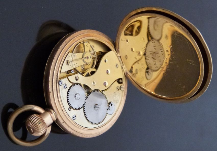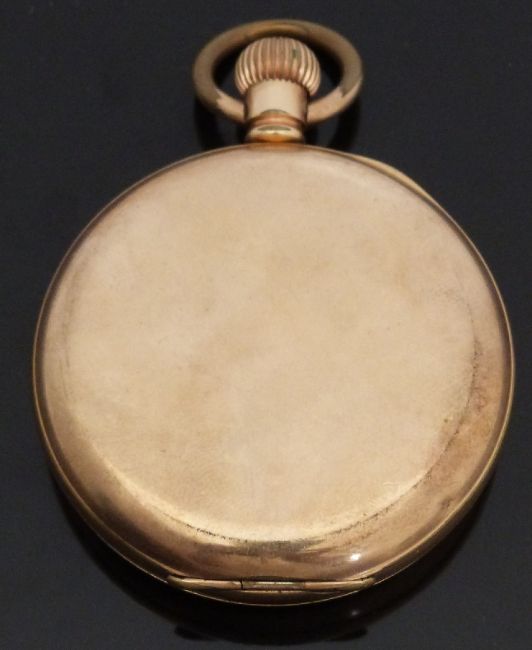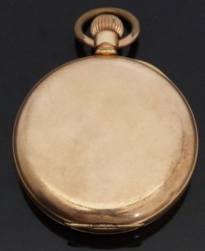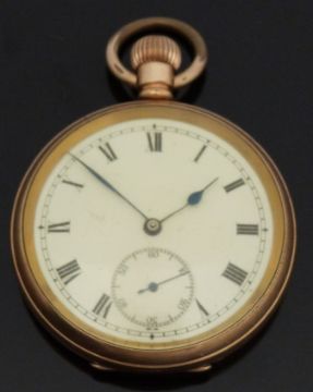 Moeris gold plated open faced keyless winding pocket watch with inset subsidiary seconds dial, blued hands, black Roman numerals and signed movement, case diameter 50mm, serial number 261280.