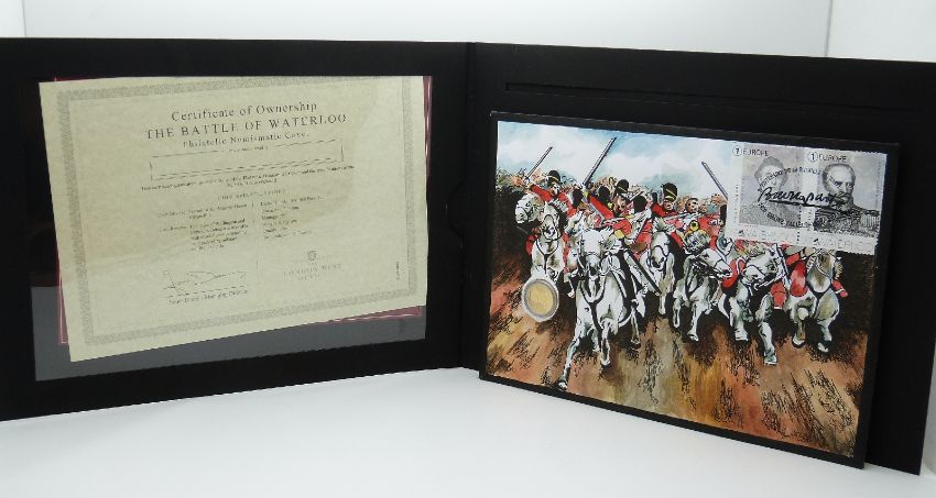 London Mint Office gold coin and stamp cover commemorating The Battle of Waterloo, comprising 916/1000 pure gold, 3.12g, and European stamps in presentation pack