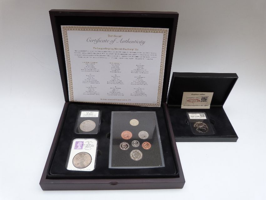 Date Stamp Longest Reigning Monarch set, comprising brilliant uncirculated 2015 UK set, 1953 Coronation crown and a 2015 five pound example in slabs with certificate, together with a further 'Waterloo' example