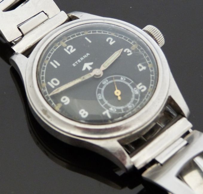 Eterna gentleman's military wristwatch with inset subsidiary seconds dial, luminous steel hands, luminous hour markers, white Arabic numerals, railroad minute track, ministry arrow to the black face, stainless steel case marked to the back and inside 'WWW P 3887 3112215' below ministry broad arrow and signed movement, on stainless steel bracelet, case diameter 46.5mm, serial number 3091206. One of the 'Dirty Dozen'