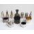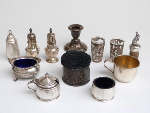 Walker & Hall three piece cruet set, pair of hallmarked silver peppers, open salt and a small cup marked sterling, weight 180g, hallmarked silver mounted pin cushion, silver candlestick, pair of silver sheathed glasses and a plated squirrel cork