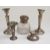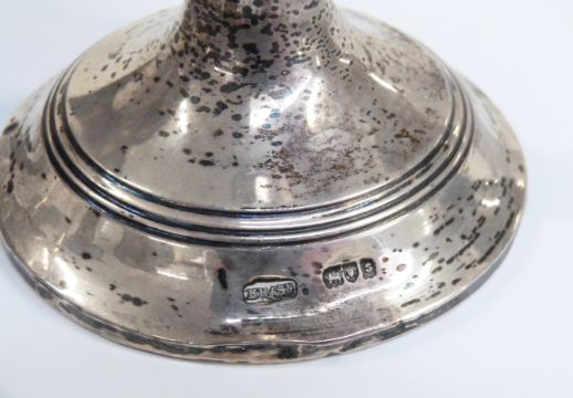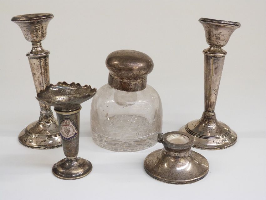 Hallmarked silver mounted cut glass inkwell, height 10cm, pair of hallmarked silver candlesticks height 14cm, hallmarked silver capstan inkwell base and a plated HMS Renown vase