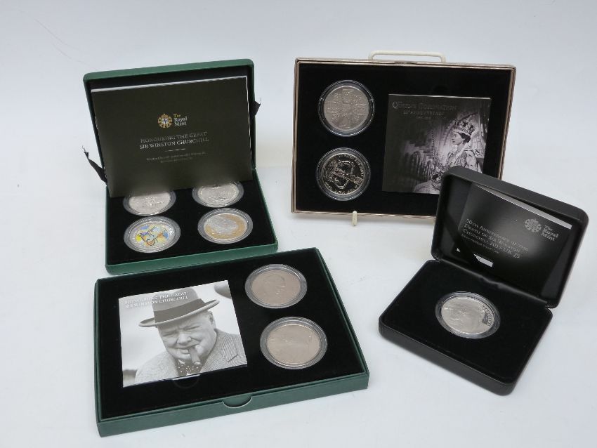 Royal Mint four-coin silver proof 2015 Winston Churchill five pound coin set, cased with booklet and certificates, together with a Winston Churchill silver proof piedfort £5 a commemorative cupro nickle two coin set and a similar Queen's Coronation example