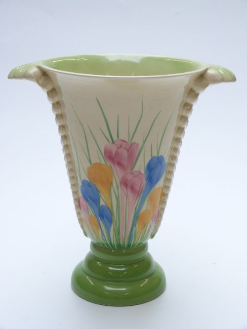Clarice Cliff twin-handled pedestal vase decorated with Spring Crocus, 30cm tall