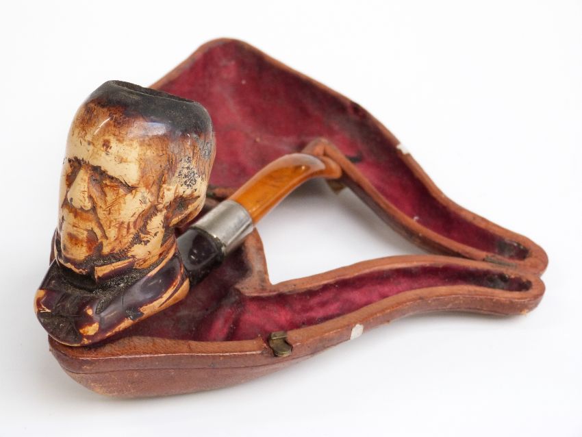 Cased Meerschaum pipe with carved figural decoration, length 15.5cm